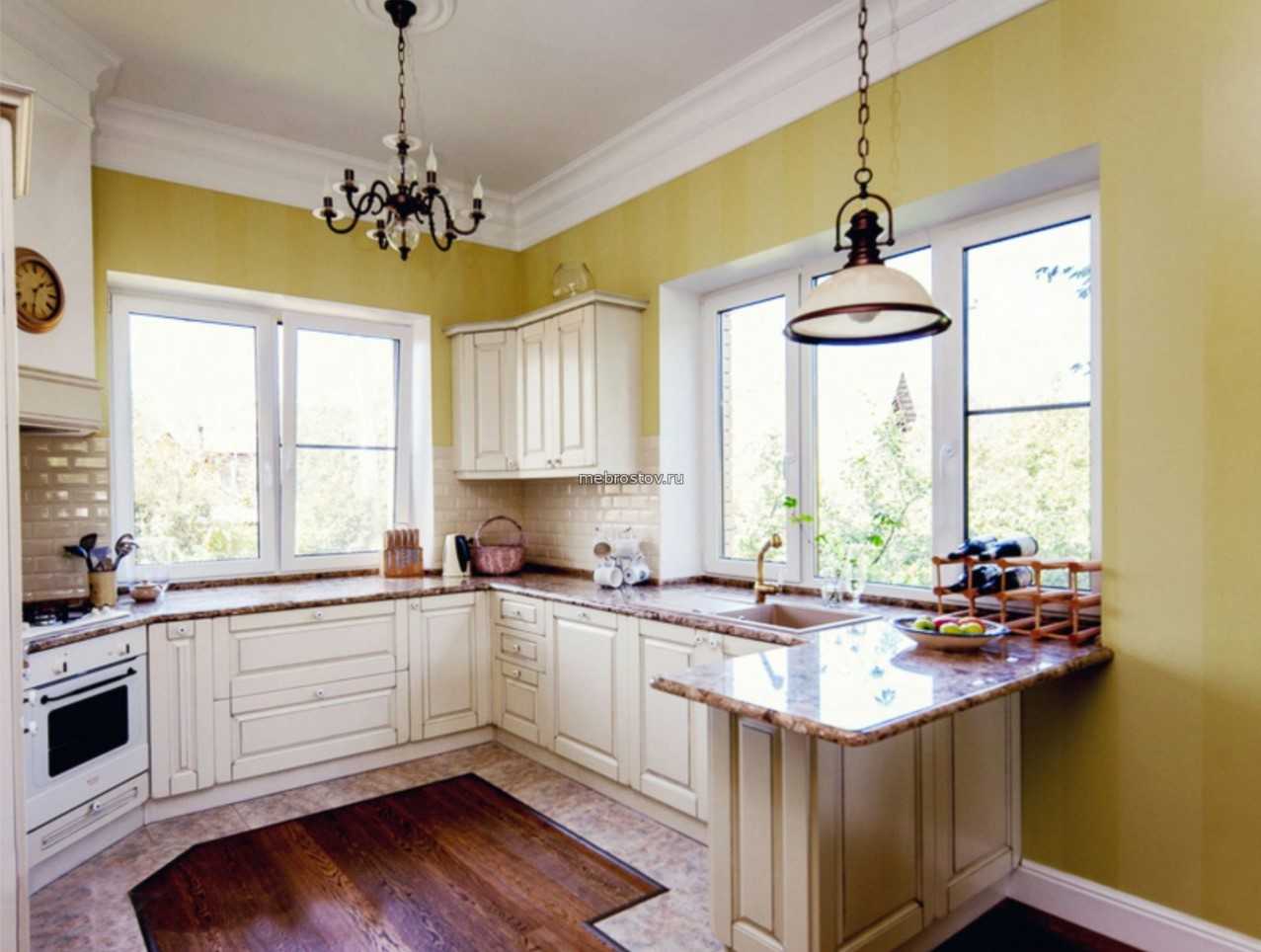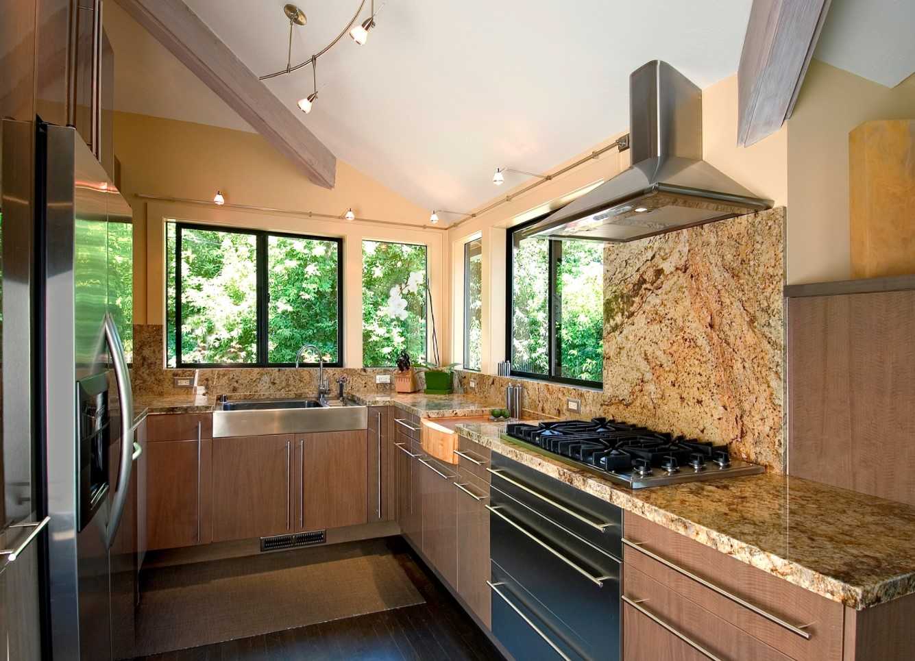 Чаще всего окна располагаются на двух смежных стенах, поэтому логично протянуть Г-образный кухонный гарнитур непосредственно вдоль них. В этом есть скрытый смысл: через окна поступает больше света, поэтому процесс готовки максимально облегчается и становится комфортным.