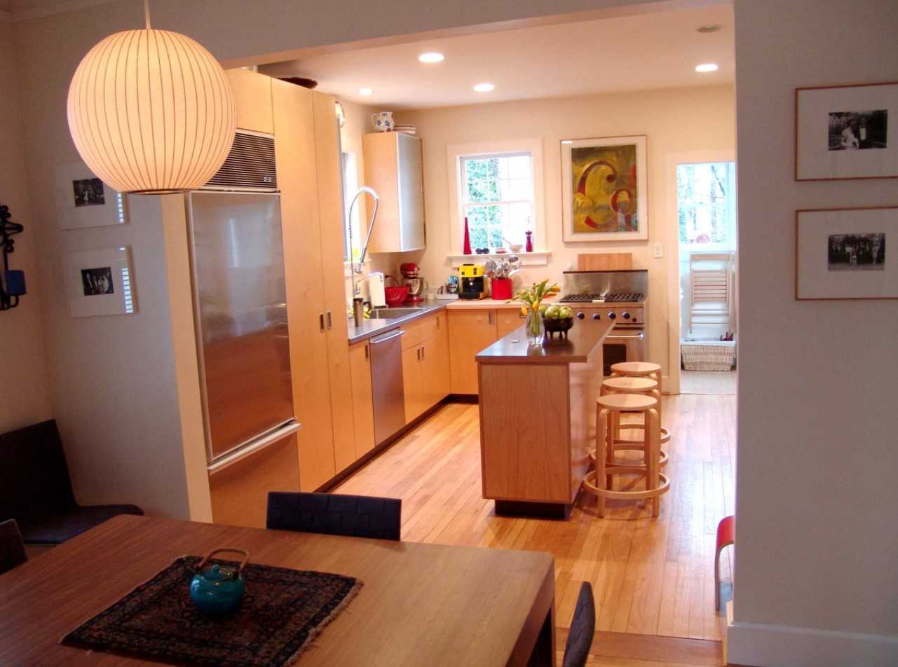 Обеденную зону следует располагать вдоль стены, параллельной кухонному гарнитуру. Обычная линейная конфигурация идеально отвечает всем условиям и рекомендуется к использованию.
