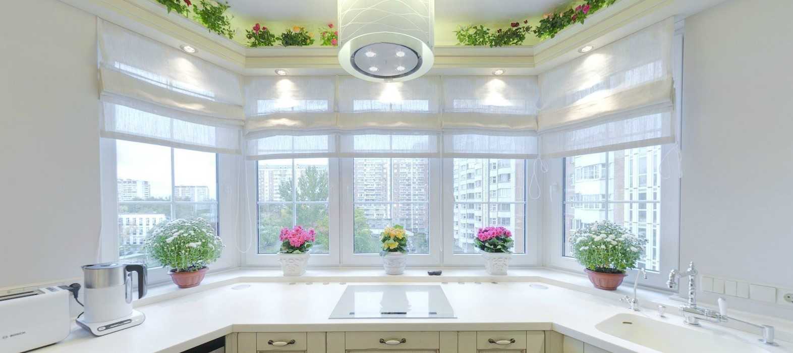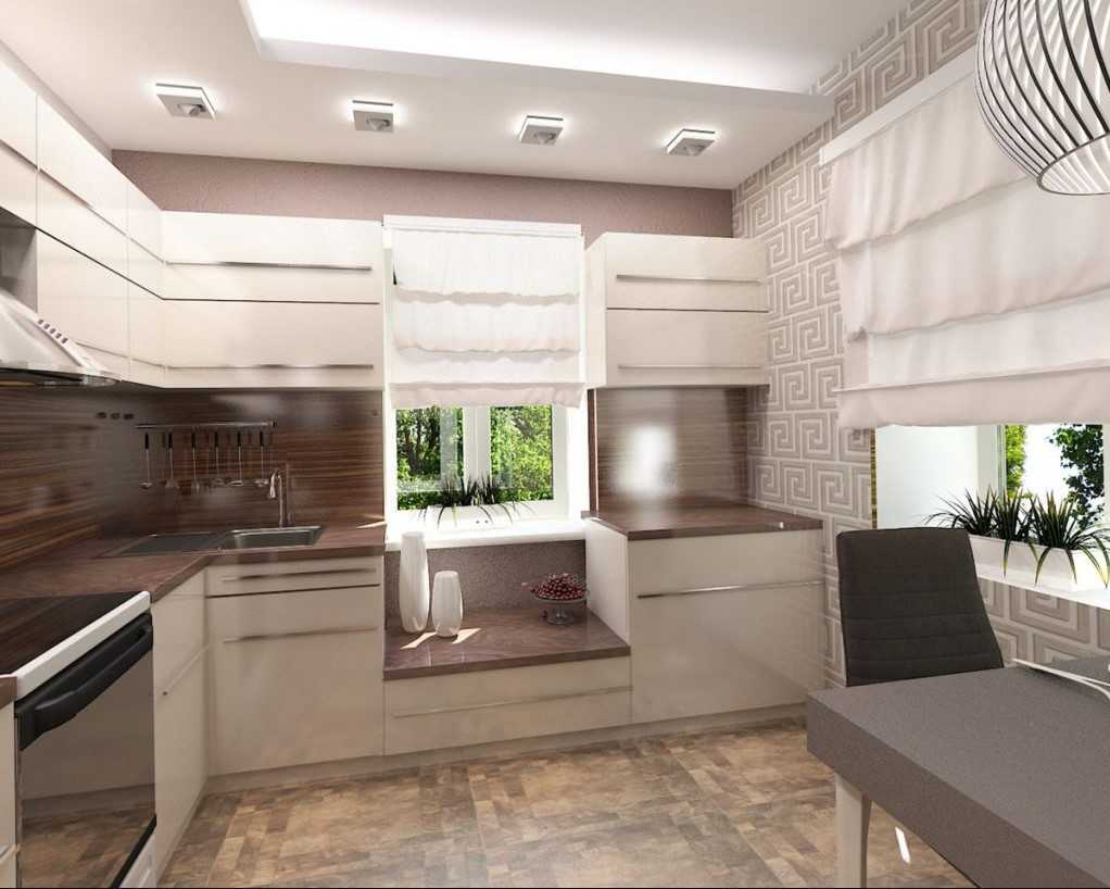 Помещение с окнами с двух сторон имеет преимущество в виде хорошей естественной освещенности. Но в то же время в нем проблематично расставить кухонную мебель стандартным образом.