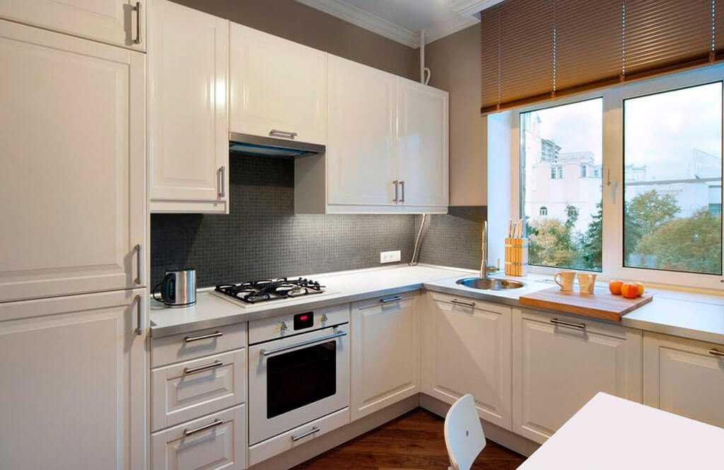 Планировка кухни с раковиной у окна прекрасно подойдет для действительно маленьких помещений и красивого вида за окном. Но помимо красоты есть и недостатки, например, в необходимости каждый день протирать стекло от брызг, сложности проводки труб и так далее.