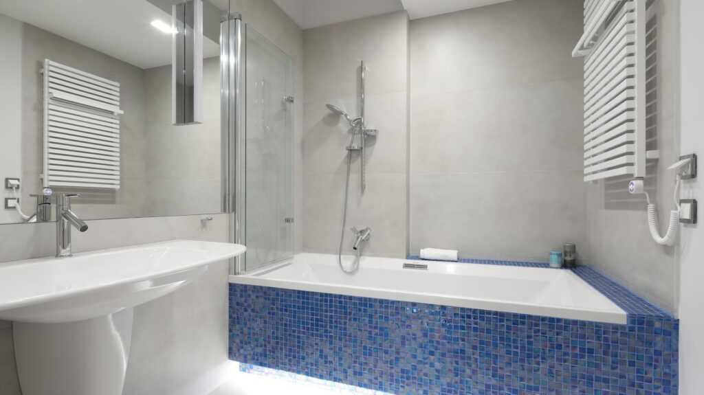 - Не забывайте о дизайне интерьера ванной. Если в помещении присутствует множество разных оттенков, то для облицовки рекомендуется приобретать более приглушенные мозаики.