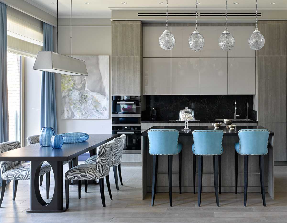 - «Игра фактур». Фартук на кухню под мрамор будет гармонично смотреться с глянцевыми фасадами.
