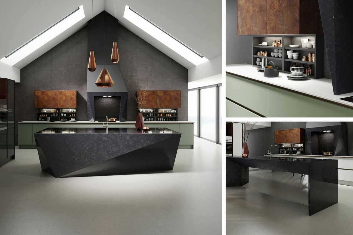 Темные тона. Мраморный фартук темных тонов гармонично комбинируется с шалфейного цвета шкафом и деревянным островом на кухне.