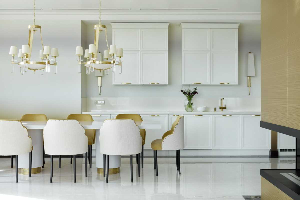- Белый фартук. Кухня из древесины может эффектно контрастировать со столешницей и фартуком из мрамора белого оттенка. Шкафчики светло-зеленого и кремового цвета можно комбинировать с позолоченными ручками и белым мрамором на фартуке.