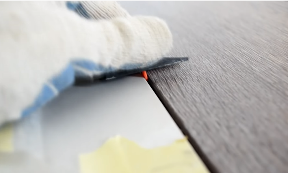 В месте примыкания ламинированных панелей и плитки срезаем часть подложки и пленки, оставляя около 10 см основания непокрытым. Отрезаем ламинированные панели в размеры и проверяем качество стыковки. Снимаем крайний ряд и убираем в сторону.