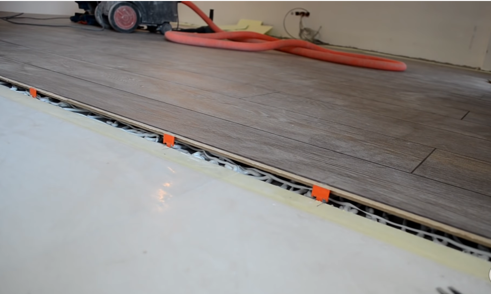 Перед укладкой ламината нужно будет настелить подложку и положить несколько ламелей рядом с плиткой. Такой прием помогает определить необходимое количество и толщину подкладочного материала. После сборки покрытия ручным фрезером вырезают шов перехода и монтируют декоративную накладку.