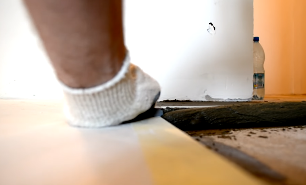 Фиксируем крайний ряд ламината, используя пластичный клеевой состав, имеющий хорошую адгезию к обоим типам напольного покрытия и обладающего достаточной пластичностью. Наносим подготовленный состав на ранее очищенное от подложки основание.