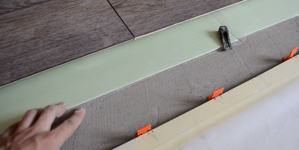 Через сутки, дождавшись полного высыхания клеевого состава, СП можно убрать. В результате формируется идеально ровная поверхность между плиткой и ламинатом.
