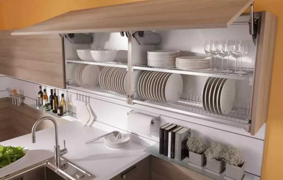 Встраиваемая сушилка. Этот вариант до сих пор находится в фаворитах у многих хозяек. Посуда будет защищена как от пыли, так и от чужих глаз. Такую сушилку можно встроить в навесной шкаф, напольную тумбу или выдвижной ящик.