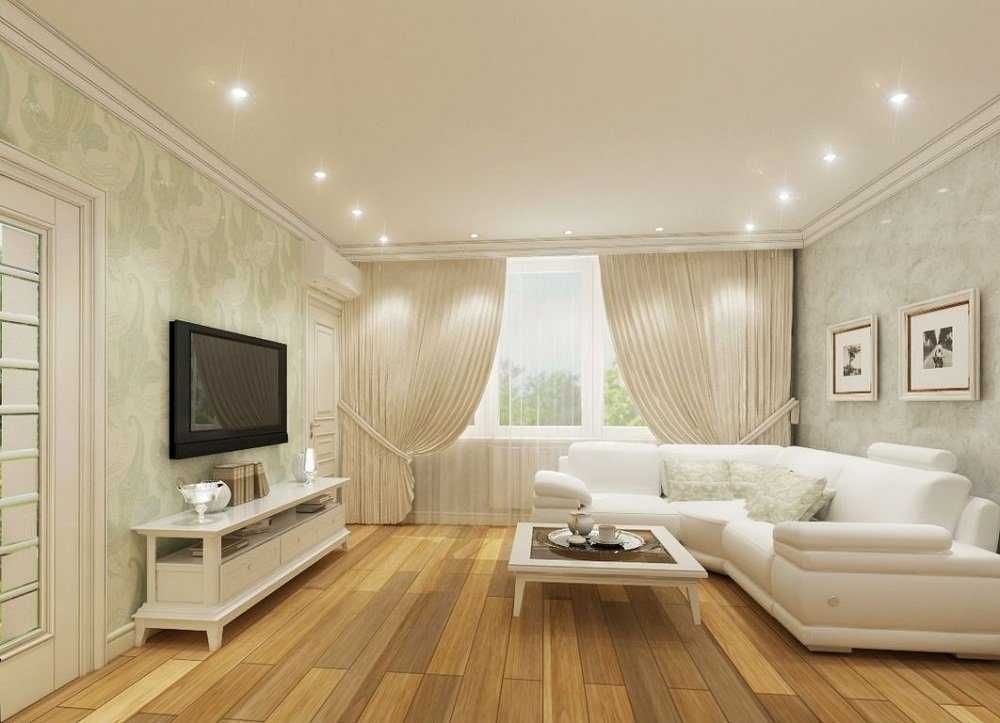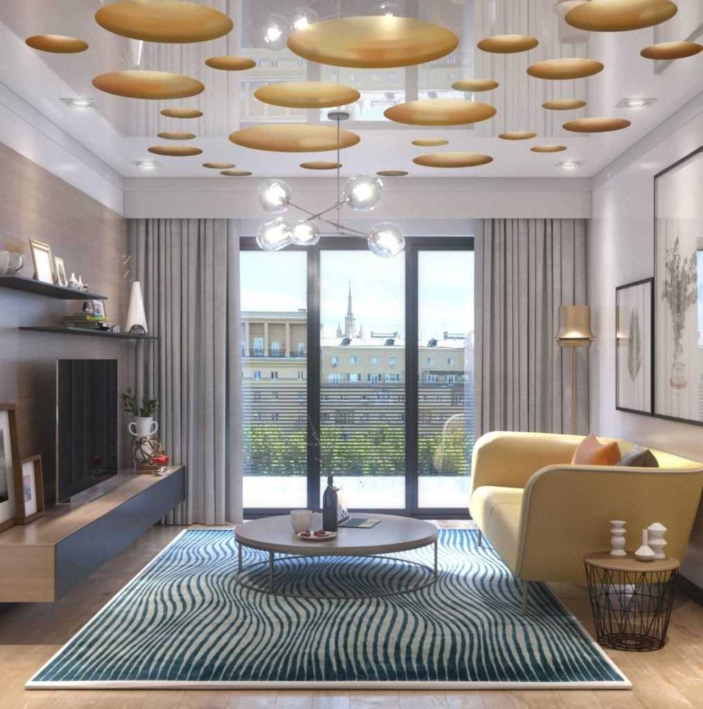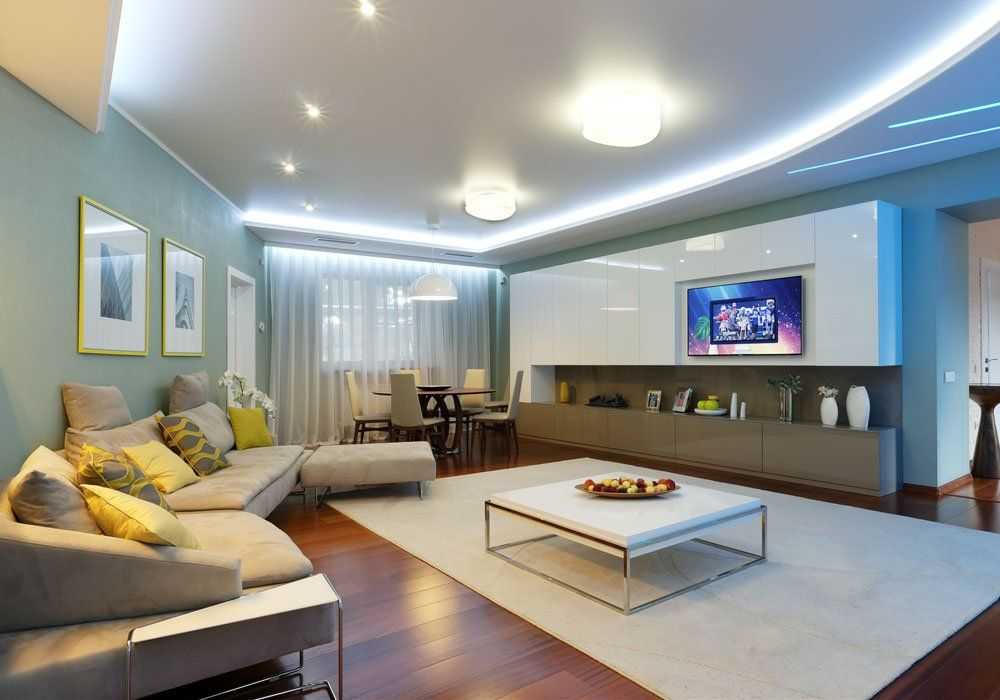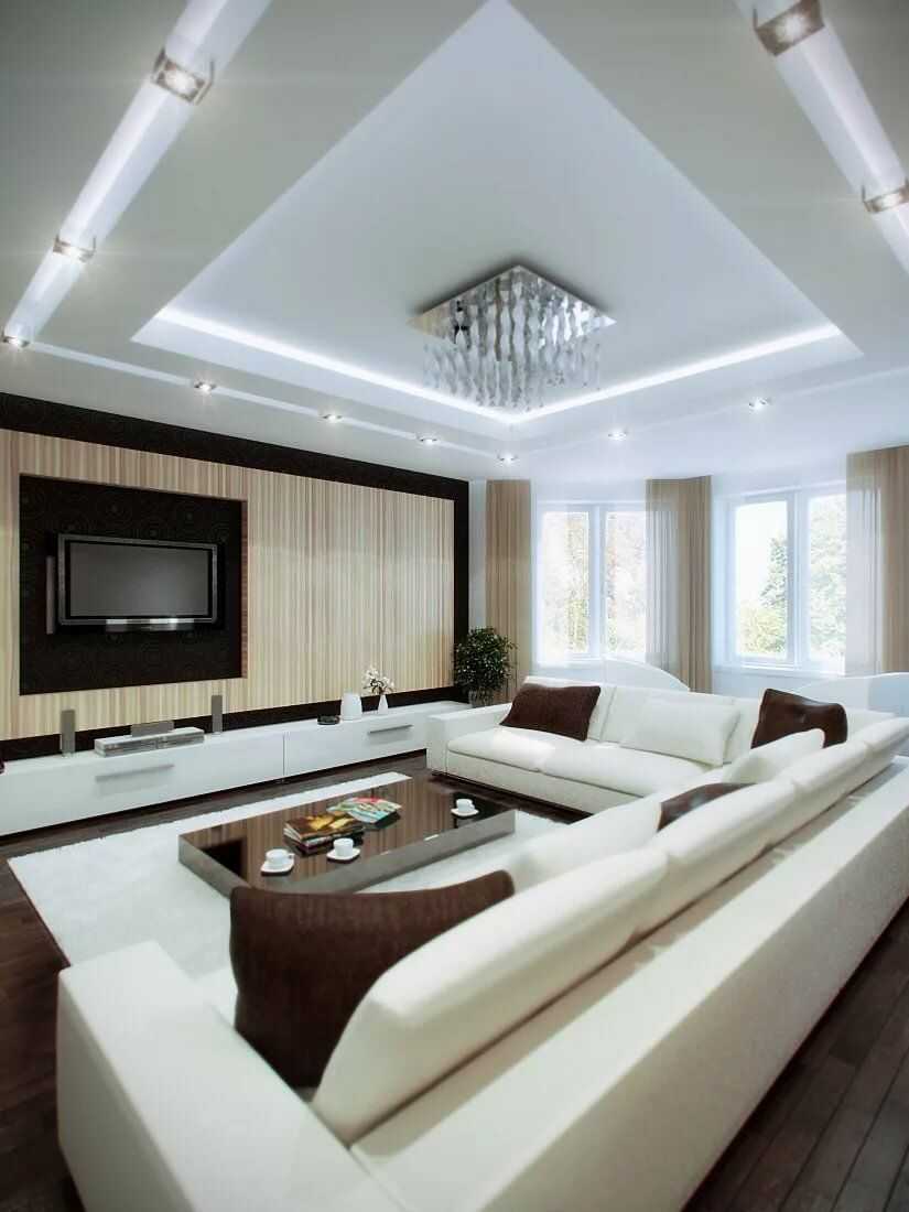 Как известно, свет в гостиной играет очень важную роль. Подвесной потолок — это удобное решение, которое можно использовать в большинстве домов. Наиболее популярными среди них являются конструкции, которые могут быть выполнены из гипсокартона, а также из металлических, деревянных, древесных или пластиковых панелей. Очень популярны натяжные потолки из специальных гибких пленок.