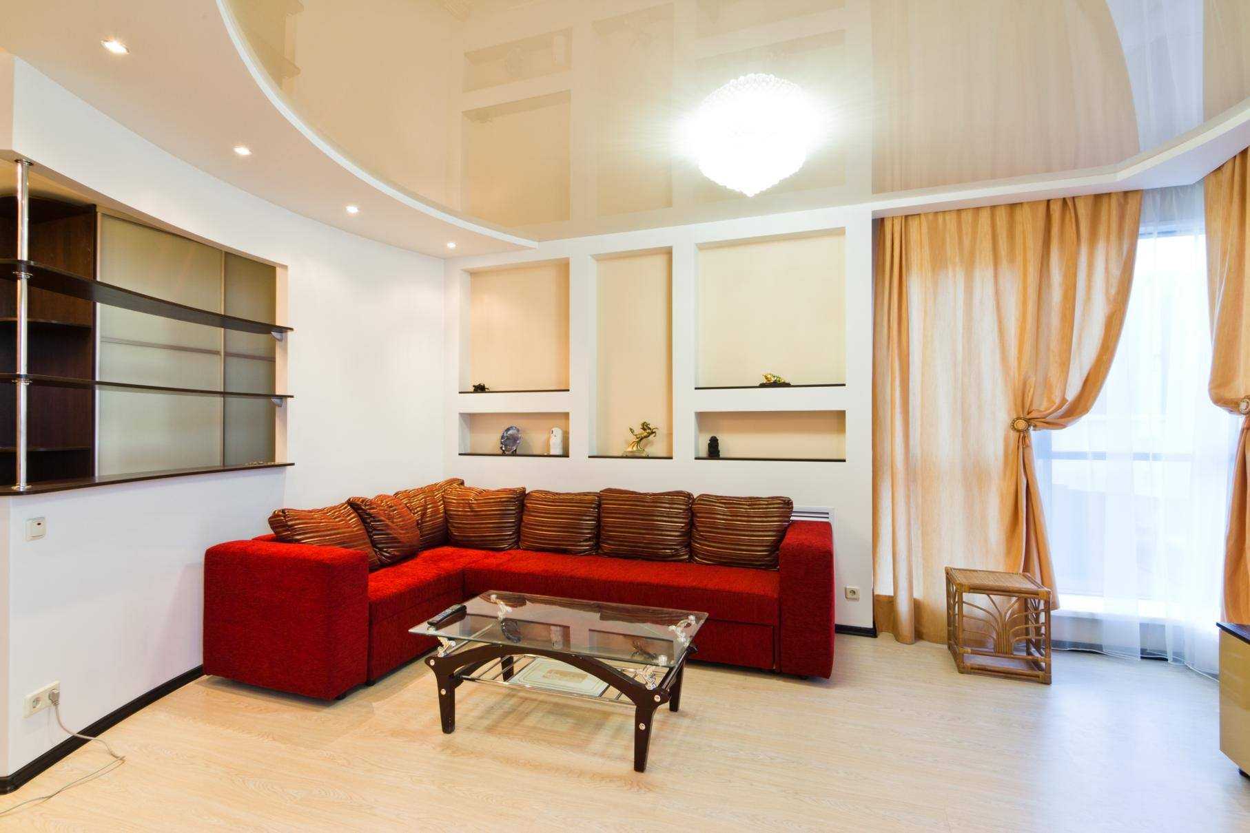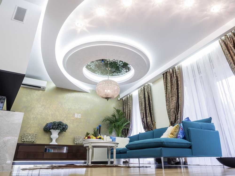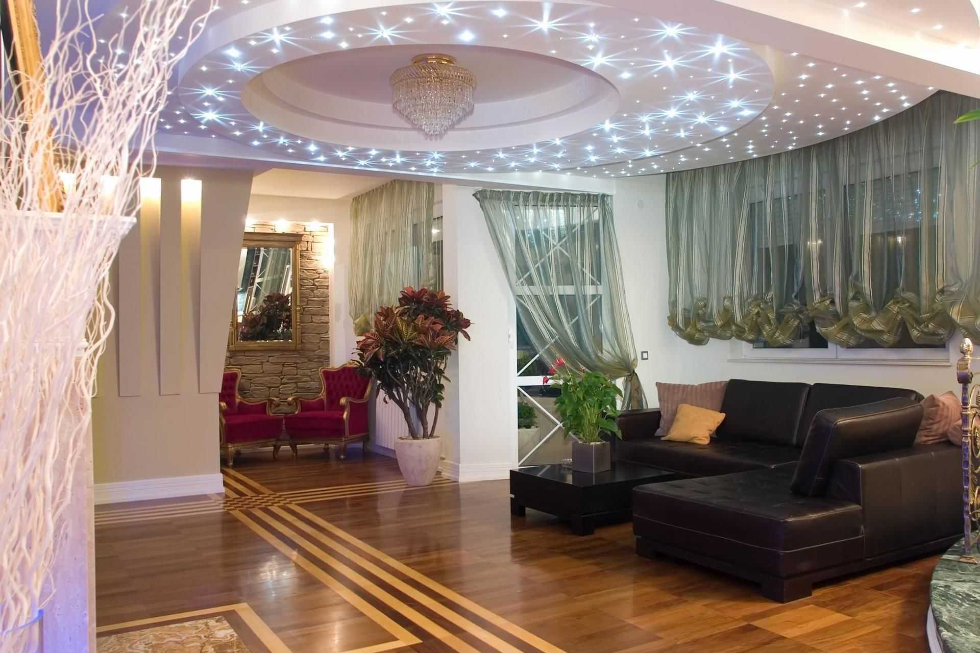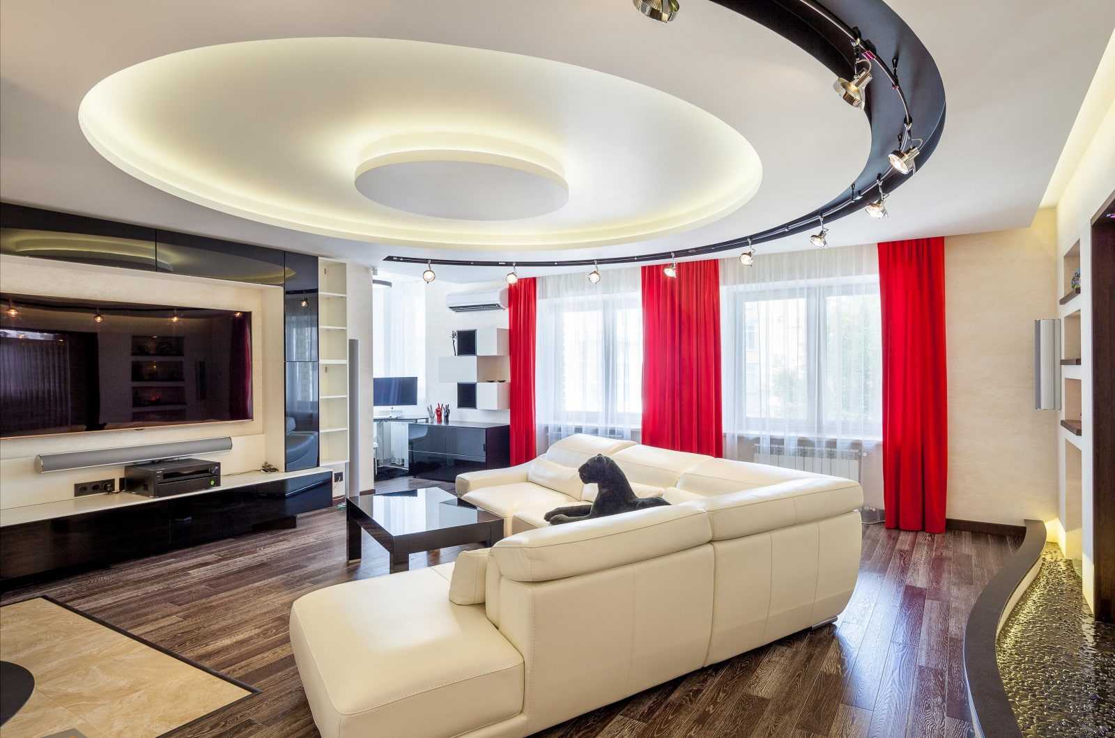 Благодаря подвесному или натяжному потолку в гостиной можно получить неординарный характер освещения интерьера, особенно если поверхность выполнена в нескольких плоскостях и совмещена с эффективными точечными лампами. С помощью подвесных потолков из гипсокартона или фибро-гипсокартона можно также формировать скосы, арки и аркады.