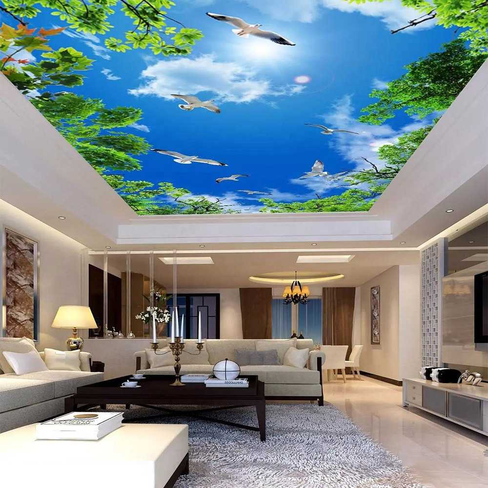 - В зоне гостиной очень красиво будут смотреться натяжные потолки с изображениями голубого неба, крон деревьев. Так у присутствующих будет ощущение, что они находятся на природе. Светодиодная подсветка по периметру или внутри натяжной поверхности создаст ощущение рассеянного солнечного света.