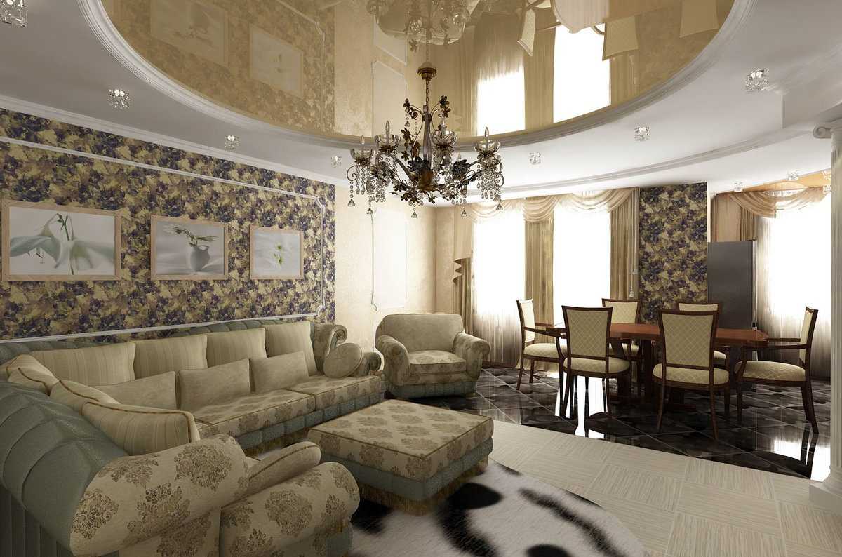 Говоря о дизайне потолка в кухне-гостиной, нельзя не упомянуть такой вид отделки, как оклейка обоями. Плюсы: долговечность (не менее пяти лет), отсутствие грязи и мусора при проведении работ, невысокая стоимость (если не покупать очень дорогие обои).