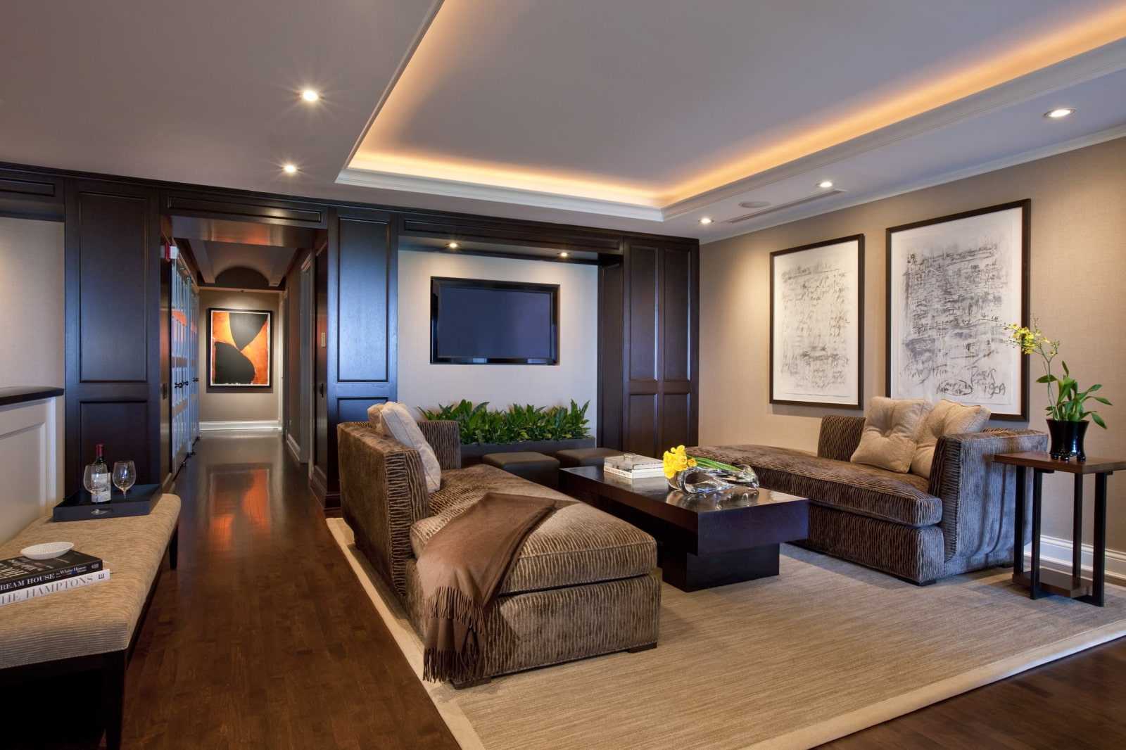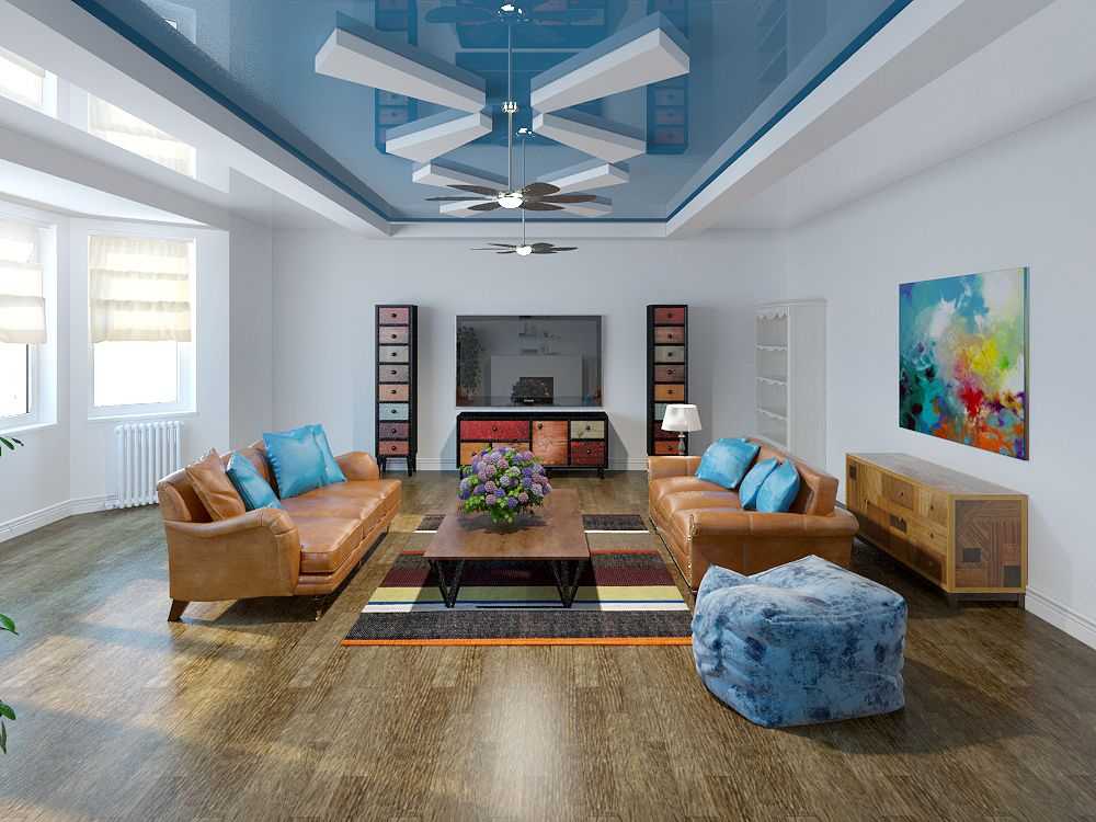 Сегодня можно повстречать натяжные потолки практически в каждом доме или квартире. Они обычно используются, чтобы спрятать или опустить слегка высокий стационарный потолок. Данный вариант отделки также играет декоративную роль, потому что скрытые в нем светодиоды прекрасно выделяют и освещают пространство. Натяжной потолок идеален для гостиной, он в любом интерьере создаст неповторимую атмосферу.
