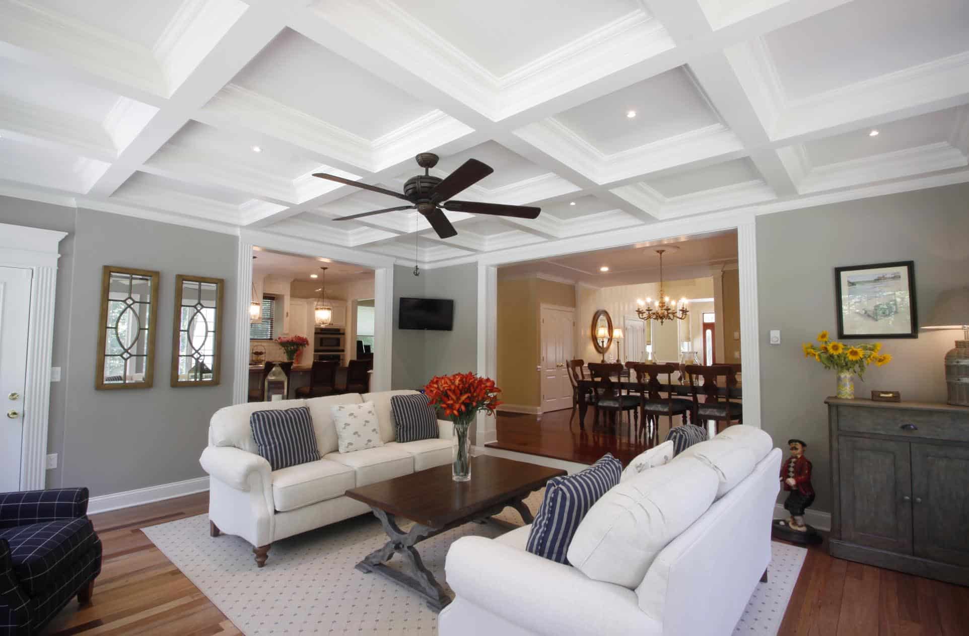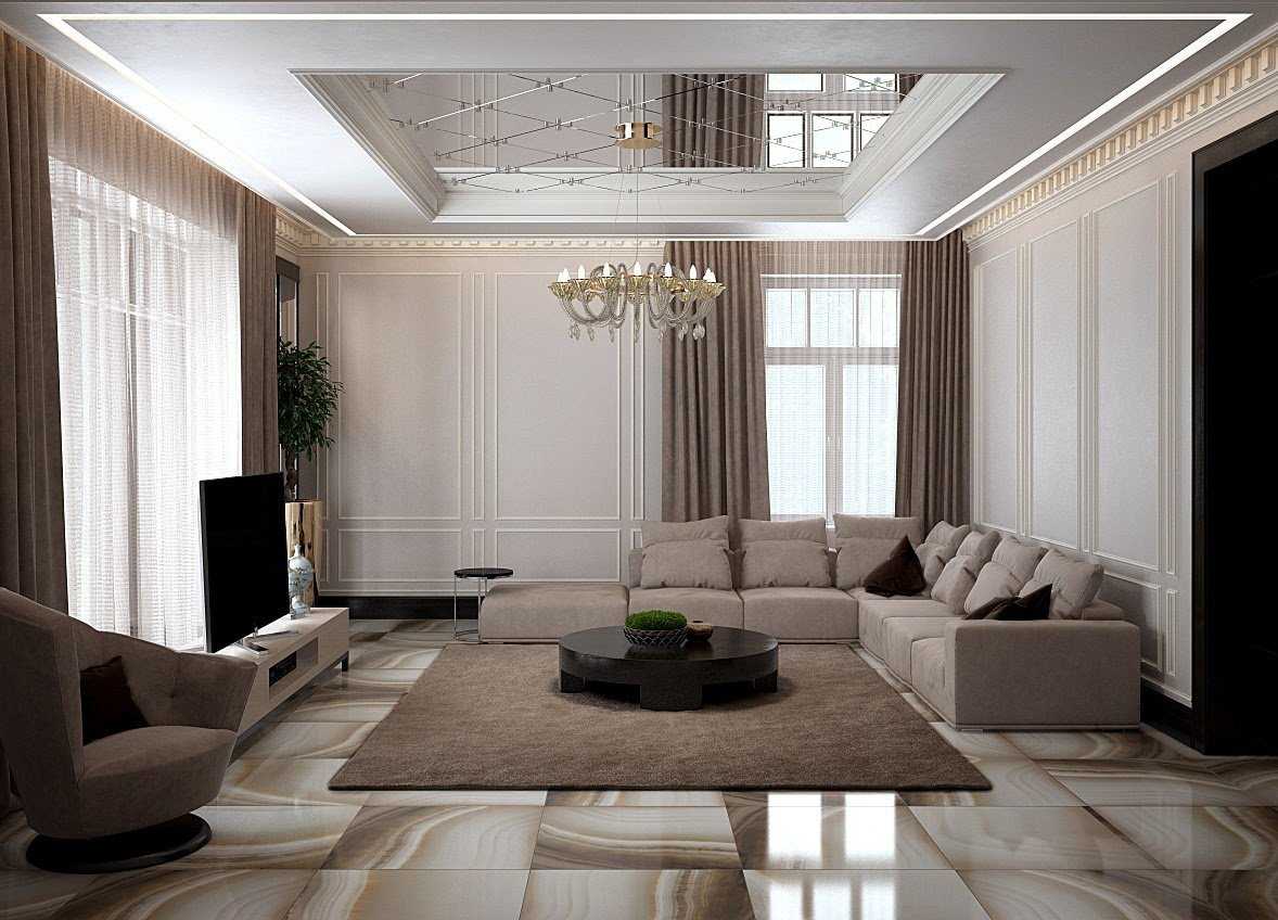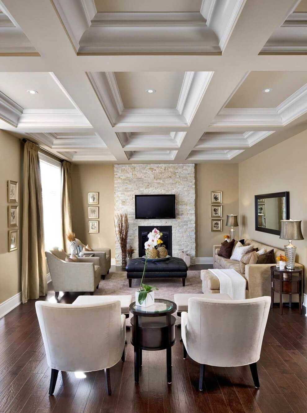 Дизайн потолка в гостиной подбирают с учетом особенностей интерьера и выбранного для оформления стиля. При этом главной задачей, как правило, является зонирование общего большого помещения, но так, чтобы пространство зрительно оставалось единым. Потолочная поверхность идеально подходит для этого.