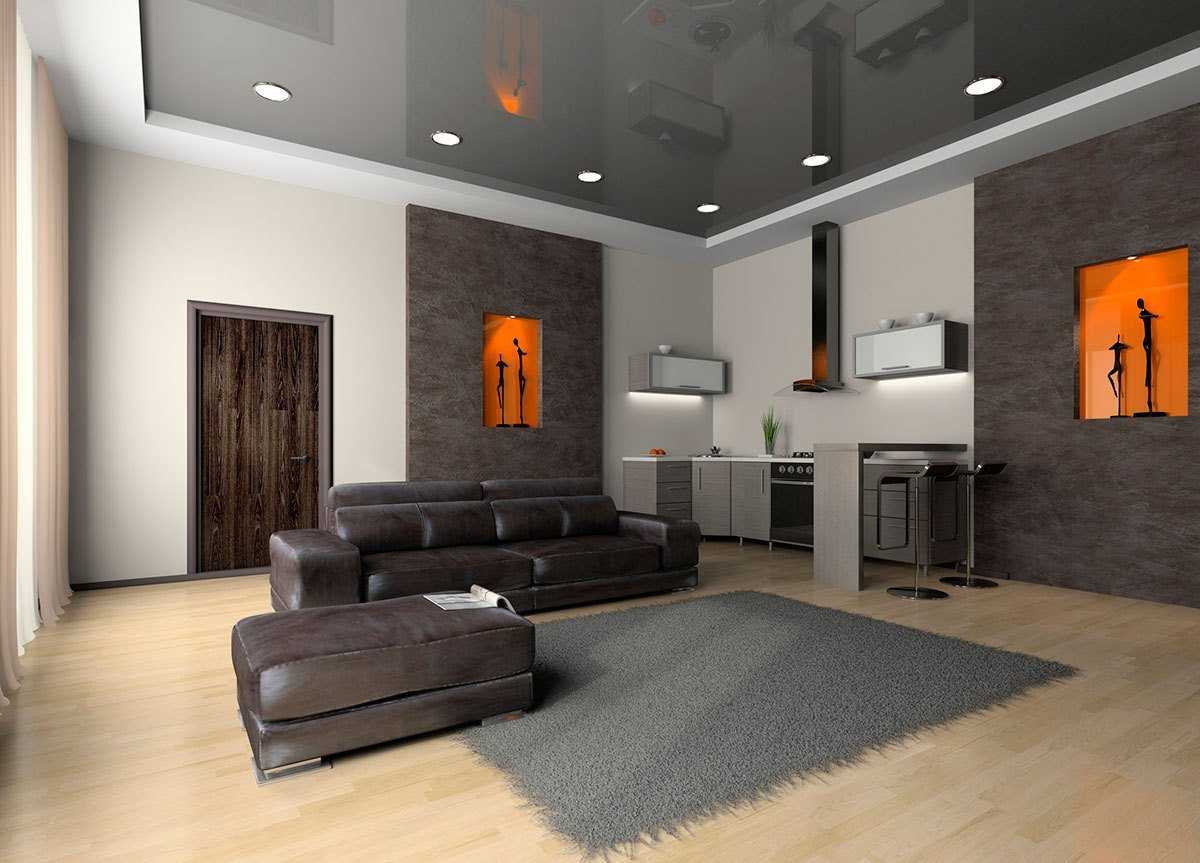 - Для потолков в зоне приготовления пищи можно выбрать глянцевые варианты поверхностей, а для гостиной, наоборот, матовые. Такое сочетание грамотно разделит пространство на части.