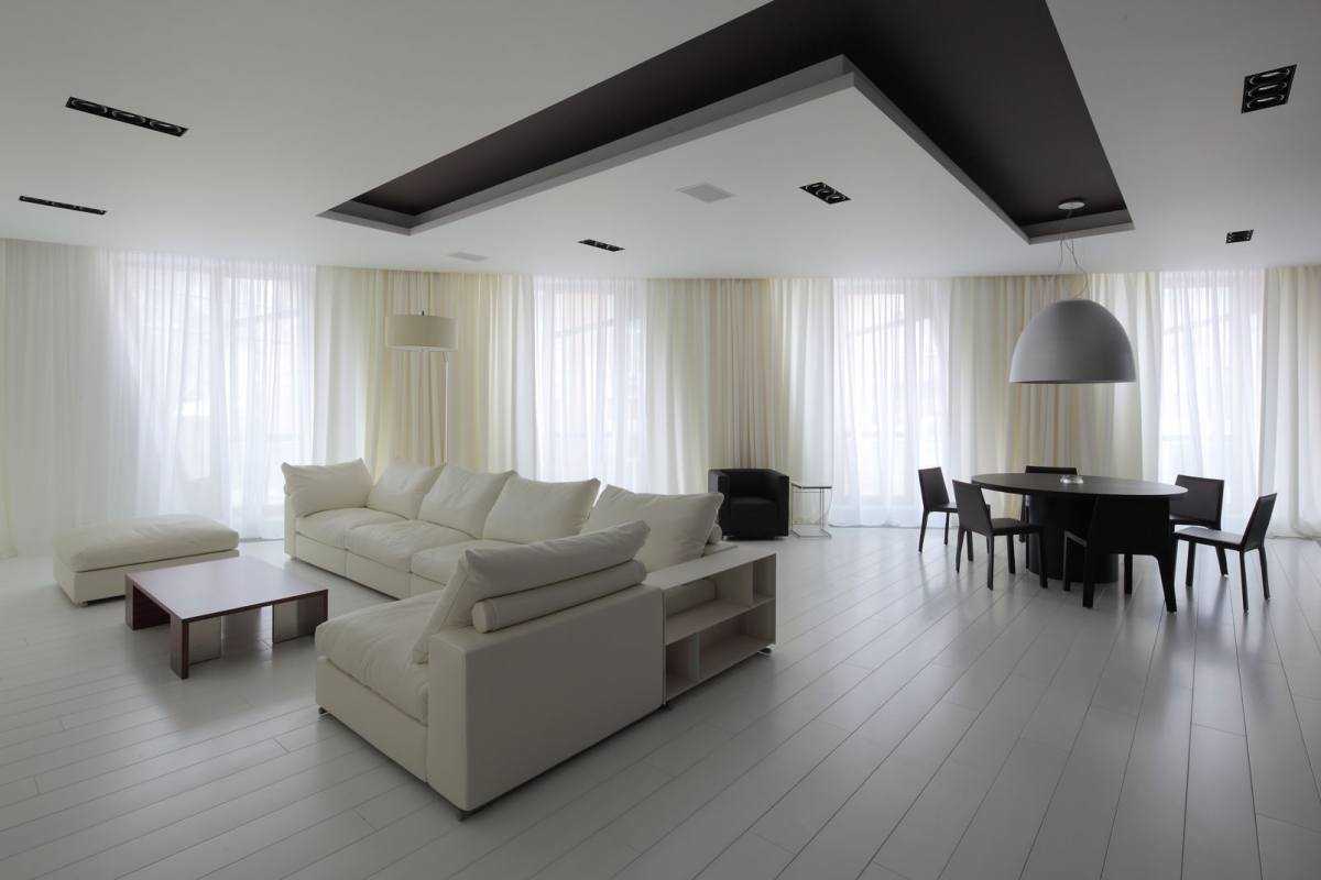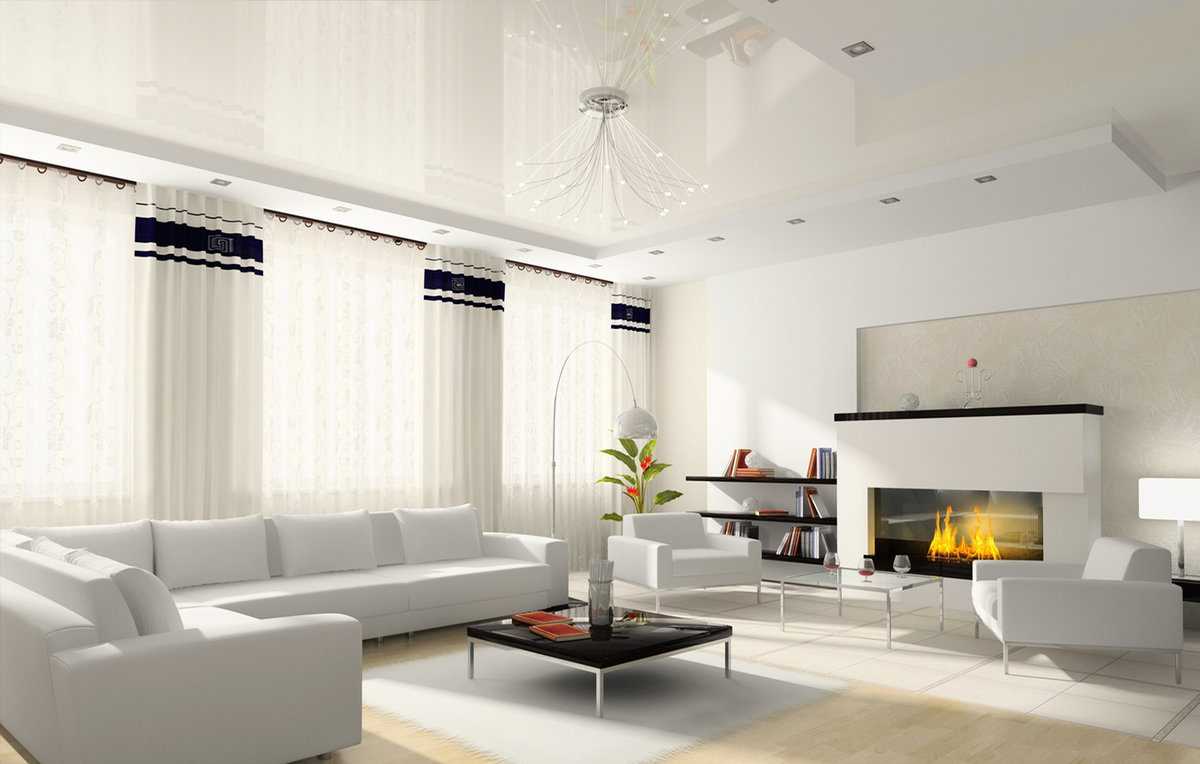 На фото интерьер кухни-гостиной, оформленной глянцевым натяжным полотном белого цвета.