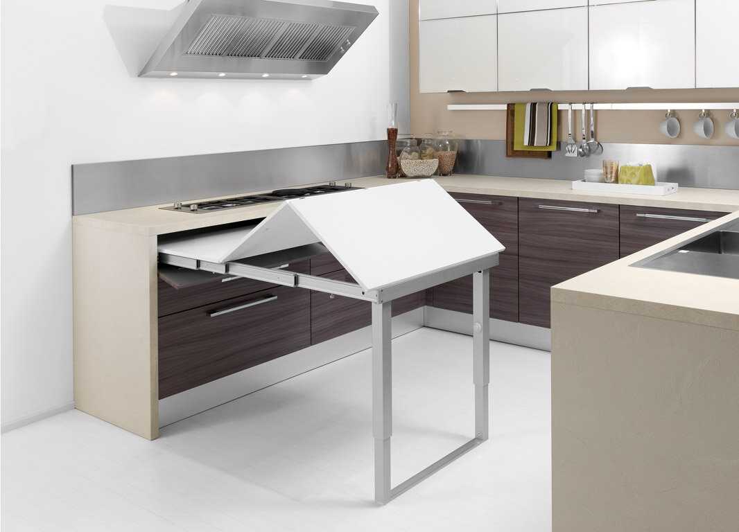 Компактная и многофункциональная мебель — отличный помощник в организации пространства. Выдвижные кухонные столы оптимизируют рабочую зону. Их встраивают в гарнитур, тем самым освобождается место для более габаритных предметов.