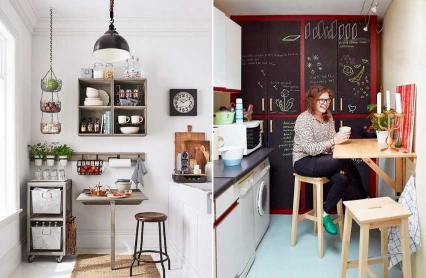 - откидная конструкция крепится к стенке, раскладывается во время обеда, а затем складывается обратно;