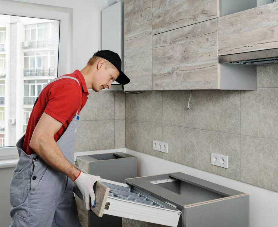 Сборка напольных шкафов осуществляется по тому же алгоритму, что навесных, только сверлить стены и крепить петли, конечно, не нужно. Единственным важным моментом будет здесь — это установка столешницы: