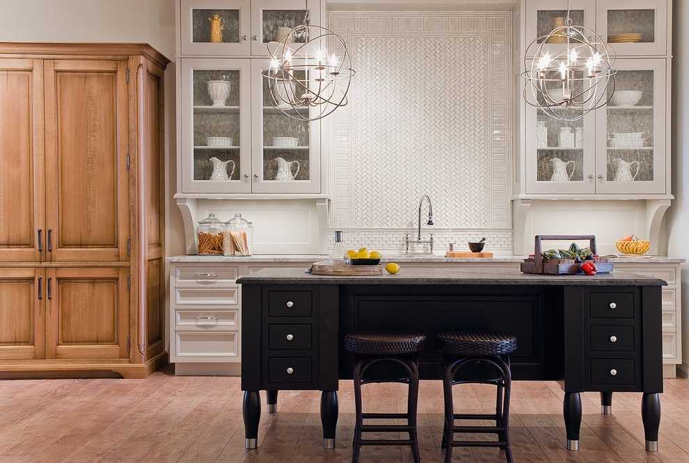 - вверху – традиционные открытые полки, возможно размещение шкафов, дверцы которых часто декорированы стеклянными вставками;