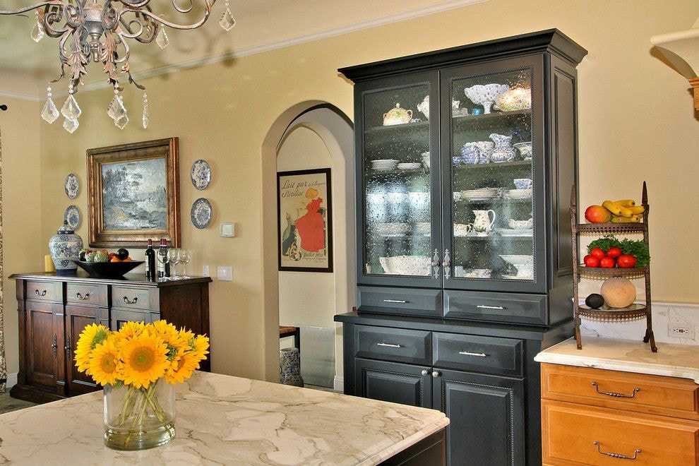 Если же площадь кухни позволяет экспериментировать с мебелью, обязательно рассмотрите в качестве одного из вариантов кухонных шкафов сервант.