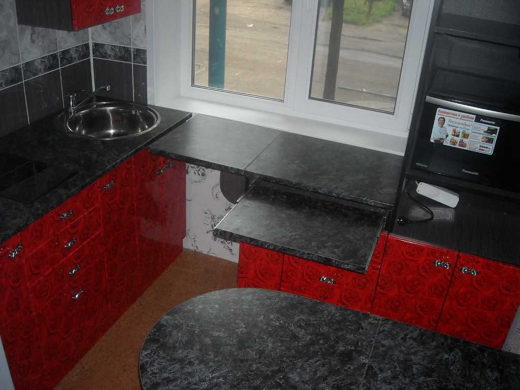 - Стол на маленькой кухне можно установить складной, прикрепив столешницу к широкому подоконнику.
