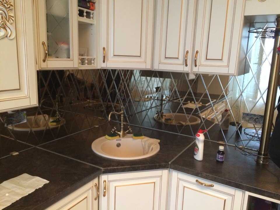 Для зрительного расширения комнаты на стенах можно повесить большое зеркало или установить зеркальный кухонный фартук.