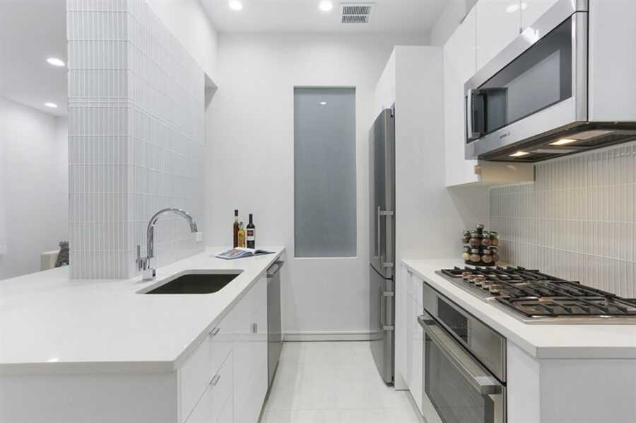 Для прямоугольных кухонь мебель лучше располагать вдоль стен. Вместо, обеденного стола лучше отдать предпочтение барной стойке.