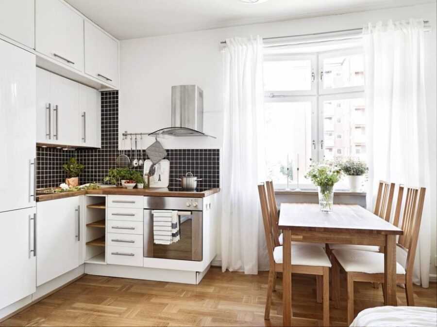 При обустройстве маленькой кухни, если она, конечно, не располагается на 1-2этаже, отличным решением будет отказ от оформления окна текстилем – традиционными шторами и занавесками. Очень стильно выглядит полностью свободное окно, что характерно для скандинавского интерьера и стиля лофт. Если такой интерьер кажется не слишком уютным, то на окно можно повесить рулонные шторы нейтрального оттенка или жалюзи.