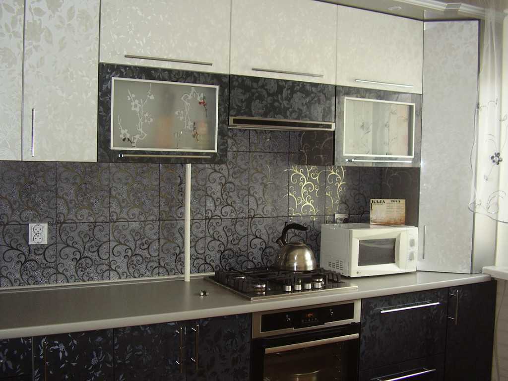 Цветной фартук разбавил темно-белый интерьерЧерно-белая кухня в стиле минимализм. Кирпичная стена смягчает контраст