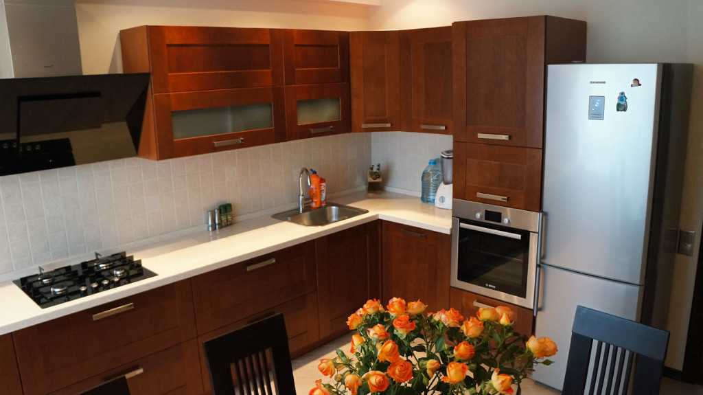 Классика любит геометрические формы – клетку, полоску. Предпочитаются гарнитуры углового и линейного типа, мебель и техника расставляются симметрично. Кухонная техника не должна бросаться в глаза, пусть она будет встроенной.
