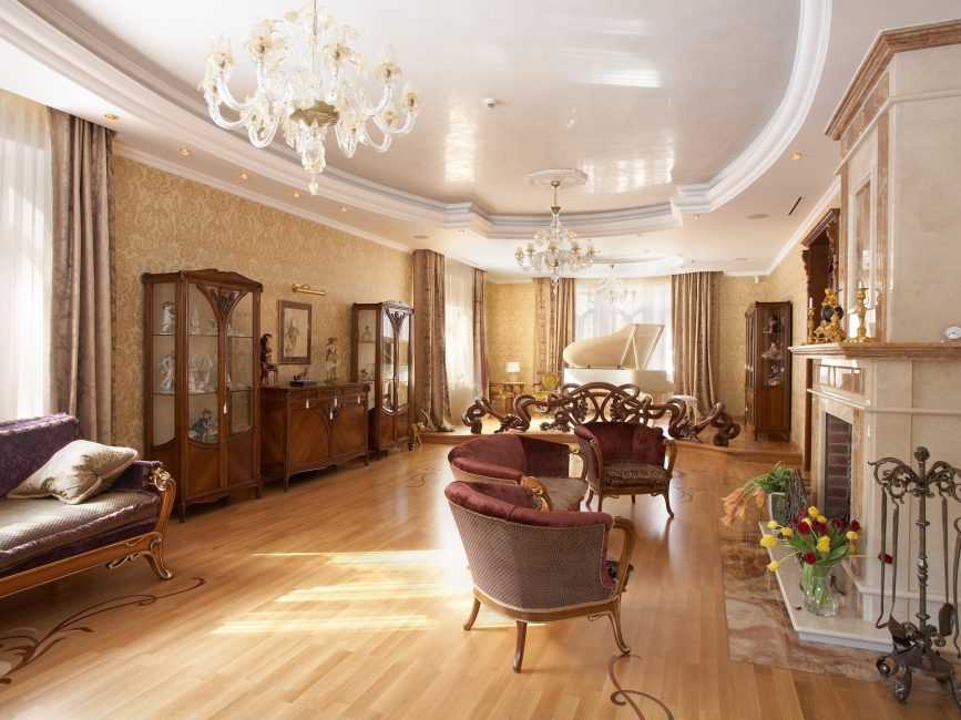 Потолок украшают лепниной и розеткой вокруг великолепной люстры с хрустальными деталями для создания игры света на поверхностях. Потолок может быть расписан фреской с библейским, военным или романтическим сюжетом. Полы выполняются из наборного паркета с художественными вставками.