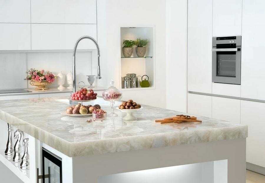 Самые красивые столешницы – из натурального камня. Они простоят вечно, но они же и самые капризные. В случае царапин и загрязнений вам придётся любоваться на них тоже вечно. Ещё менее практичны и почти такие же дорогие деревянные столешницы, а ламинированные ДСП и МДФ полотна зачастую не обеспечивают оригинальности дизайна и теряют на статусности. Идеальным материалом для столешницы на кухне признан кварцевый агломерат с учётом его внешнего вида и характеристик.