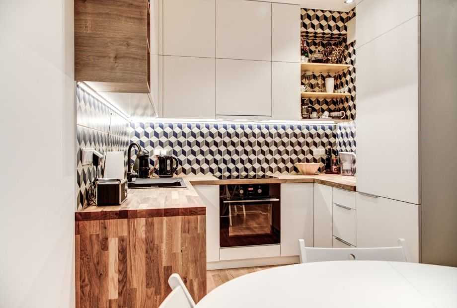 Белая кухня с деревянной столешницей характерна для дизайна помещения в стиле прованс, кантри. Отличным дополнением в этом случае станут связки овощей и фруктов, керамическая посуда, разнообразный текстиль. Столешница из ДСП под дерево или из массива дерева будет великолепно гармонировать с потолочными балками перекрытия, подоконниками, дверными наличниками.