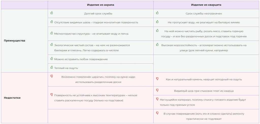 Столешницы из акрилового и кварцевого камня прекрасно вписываются в любой интерьер. Современные технологии позволяют создавать изделия высокого качества и привлекательного вида из обоих материалов, поэтому следует выбирать, исходя из собственных предпочтений. У каждого из них есть свои достоинства и недостатки, которые нужно внимательно изучить перед выбором столешницы на кухню (см. таблицу):