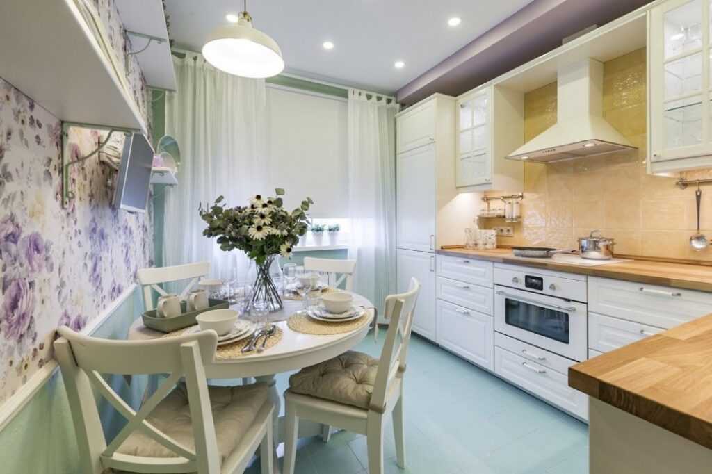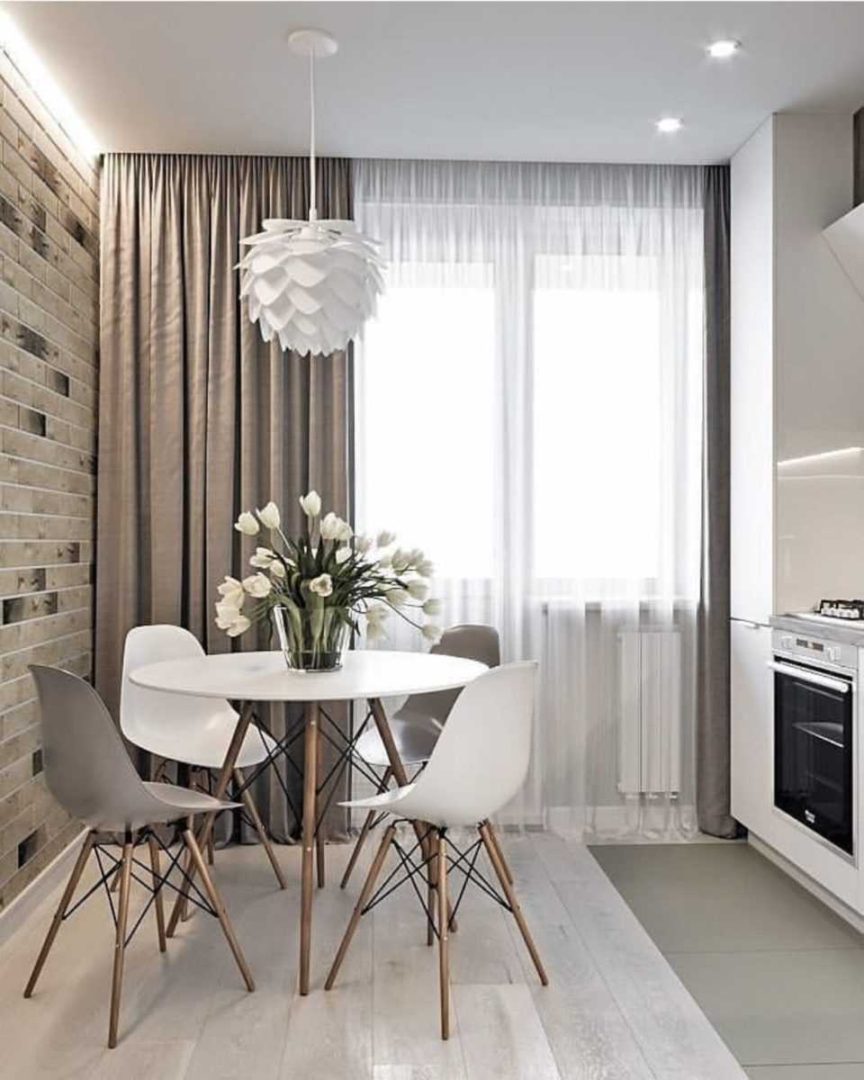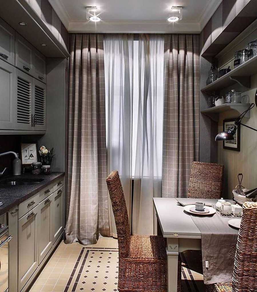 Для маленькой кухни лучше выбирать светлые шторы с небольшим принтом