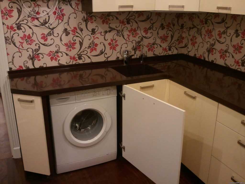 - Установить машину в одну из тумб гарнитура под столешницу;