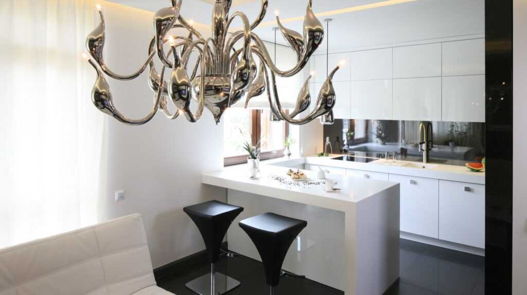 Пример классического модерна с яркими акцентами (рис.19). Оформление данной кухни выглядит грамотно и стильно. Прямоугольная белая мебель с чёрными столешницами, классическая люстра и пол, яркие пятна в виде позолоченных стульев и оригинальной мозаики над рабочей зоной – залог успешного дизайна в стиле «модерн».