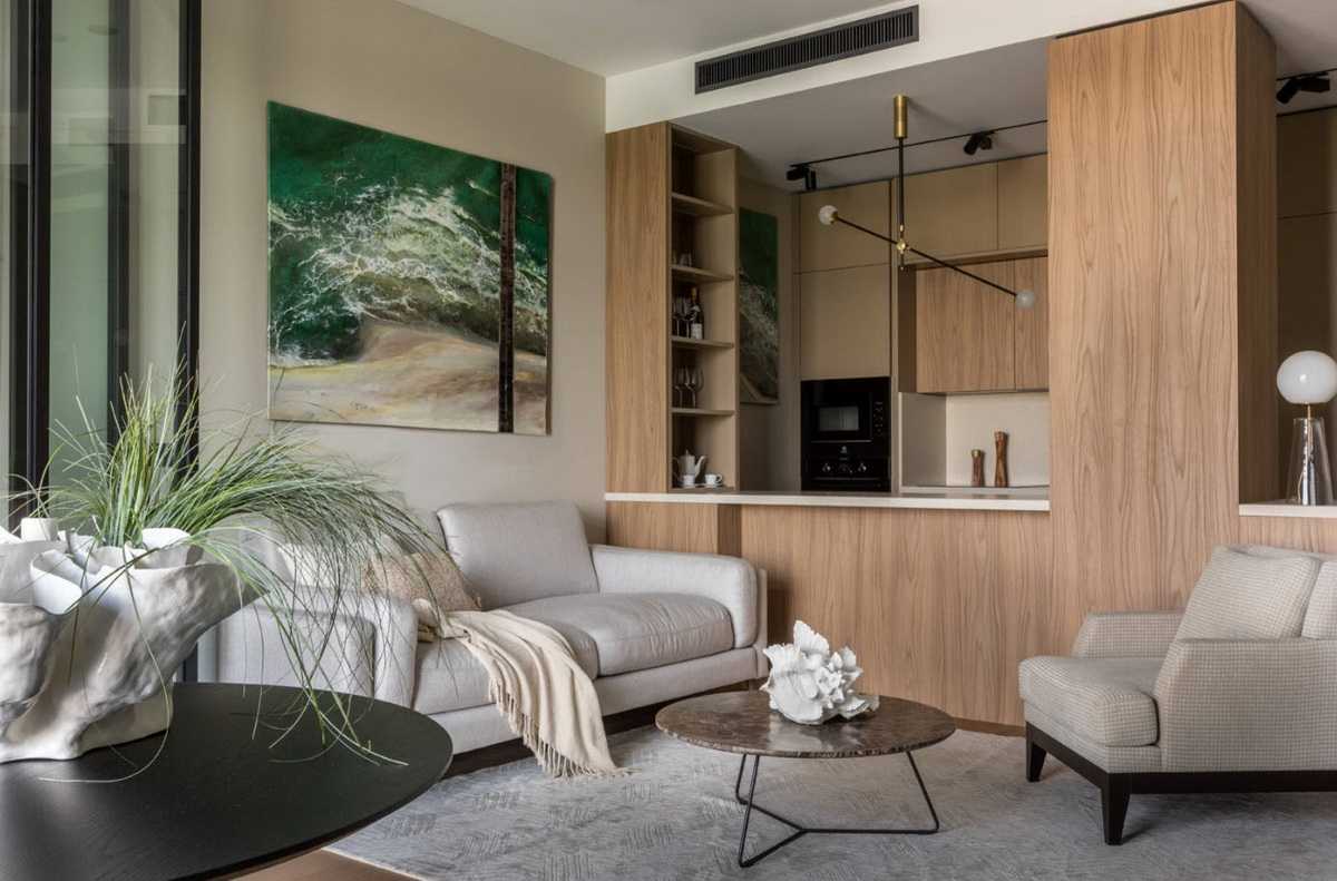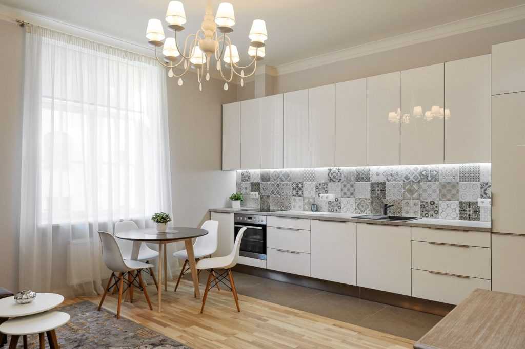 5. Хотите зрительно «спрятать» кухню и привлечь внимание к гостиной? Закажите нейтральный по дизайну кухонный гарнитур с белыми, кремовыми, светло-деревянными фасадами. Фартук — тоже нейтральный, в тон стены или кухонных шкафов