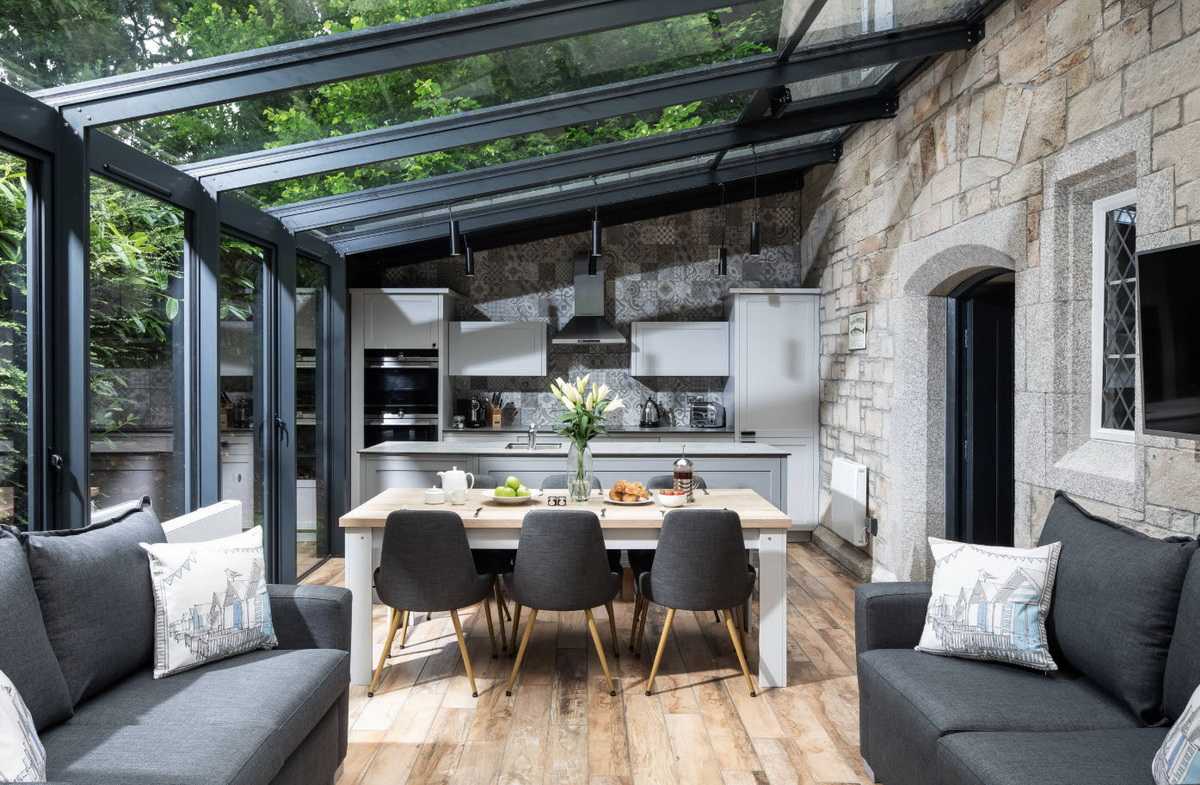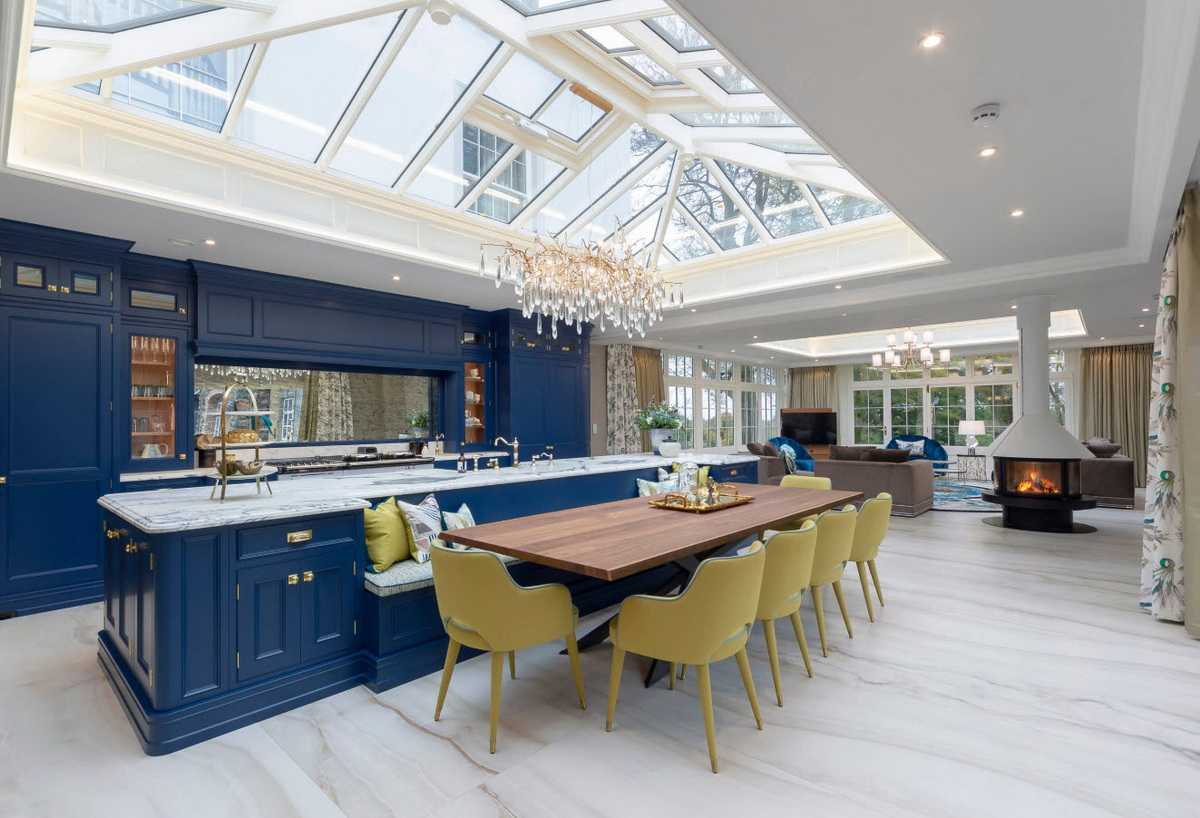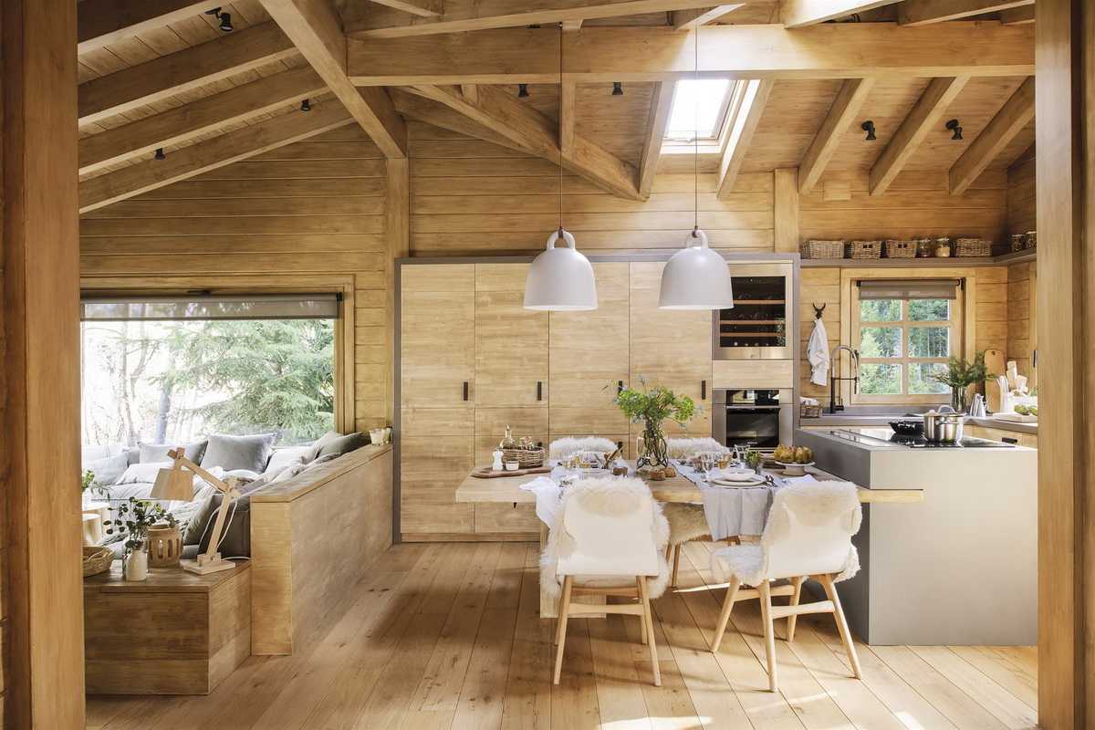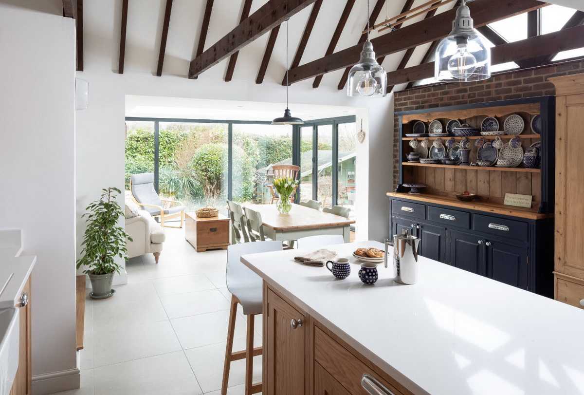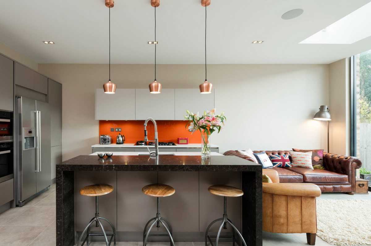 Дом имеет свои преимущества – немалый простор. Есть возможность организовать пространство с панорамными окнами и выходом в сад. А внутри создать несколько функциональных зон: кухню, обеденную зону и зону отдыха. Своеобразным отделяющим барьером между кухней и мягкой зоной отдыха станет барная стойка. Свет и ощущение свежести, обилия воздуха в пространстве обеспечат панорамные окна с видом на сад.