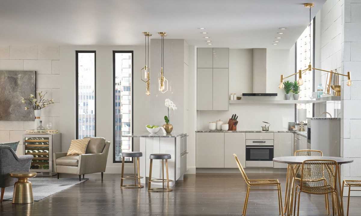 Любителям больших светлых пространств идеально подходит кухня-гостиная. А чтобы сделать это ощущение воздушности и простора максимальным, используйте для оформления стен светлые или даже белые оттенки, а яркости добавляйте цветовыми акцентами. В качестве цветовых акцентов может выступать мебель, оконный текстиль, отдельные элементы декора или даже светильники. Они разбавят обилие белого цвета и не позволят стать интерьеру скучным.