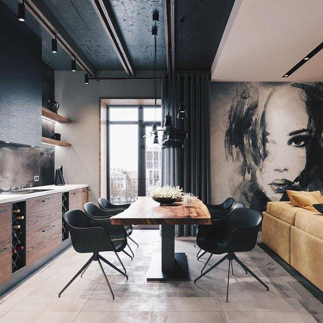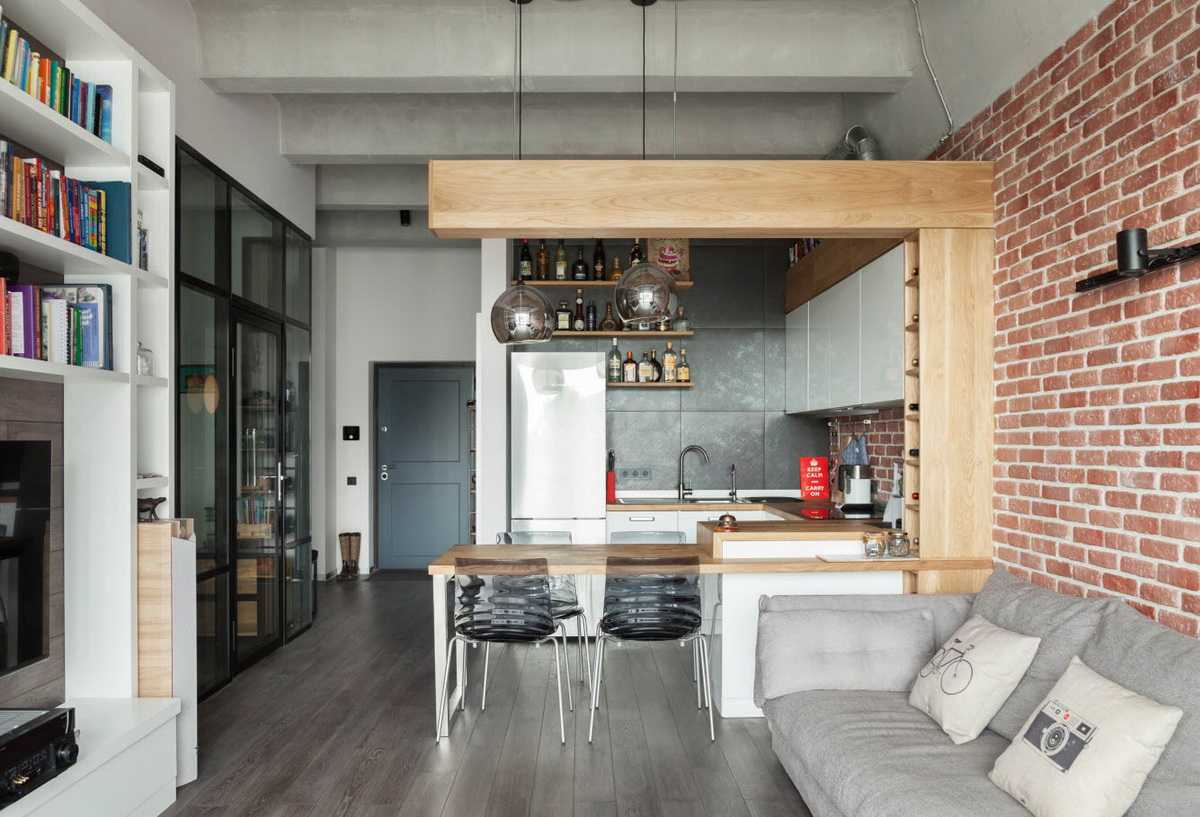 Еще один популярный выбор сегодня – лофт. Здесь пространство кухни-гостиной может быть дополнено и холлом. В итоге зона «холл-гостиная-кухня» становится центральной и занимает основную часть интерьера. Рекомендуется минималистический стиль с использованием натуральных материалов. Отлично будут смотреться деревянные балки, кирпичные стены и натуральный камень для оформления всей центральной части этой зоны.