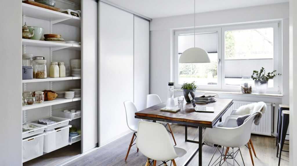 Кладовая – это дополнительное, небольшое помещение для хранения продуктов. Если ваша идея для кухни включает в себя подобное решение, кладовую лучше всего расположить рядом с главной комнатой, чтобы вам было удобно добираться за припасами. Лучшим местом по отношению к частям света будет северное, то есть такое, где солнечные лучи, способные обогреть комнату, не падают прямо.
