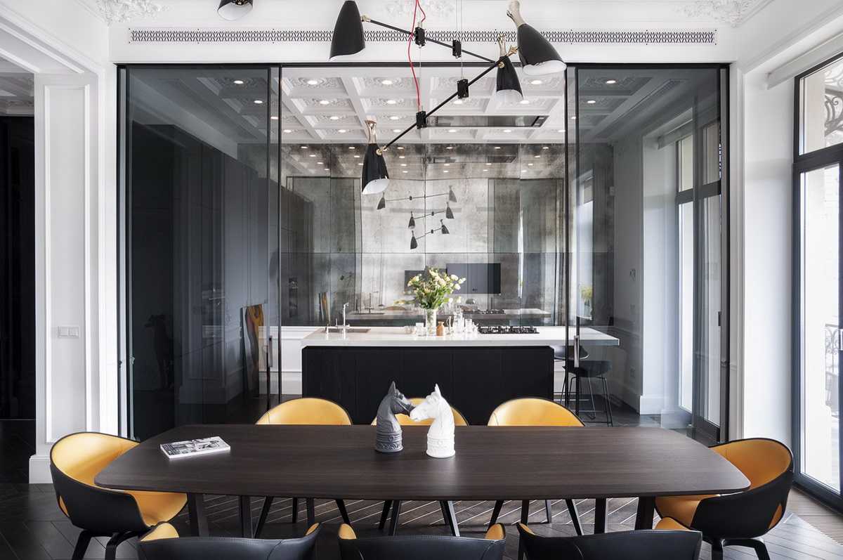 Выделение в типовой квартире кухни-гостиной позволяет провести четкое разграничение между приватной и общественной зонами. Визуально расширить пространство при объединении гостиной и типовой кухни, которая имела Г-образную вытянутую форму с двумя окнами, позволила установка стеклянной стены.