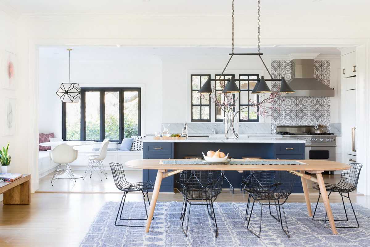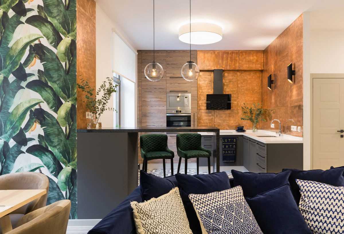 1. Современный интерьер кухни-студии — это смешение разных стилей и направлений. Отлично подойдут мягкий минимализм или скандинавский стиль с элементами других стилей — от легкой классики до хай-тека.
