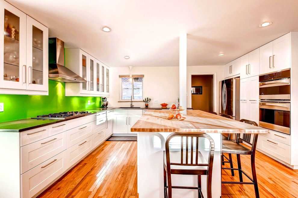 Простой дизайн кухонного гарнитура можно разнообразить с помощью интересного фартука, например, поместив за стеклом узкие фотообои с панорамным видом или сделав цветную мозаику из пиксельной плитки. Находясь в углублении, этот участок не будет бросаться в глаза, но придаст рабочему пространству свою изюминку.