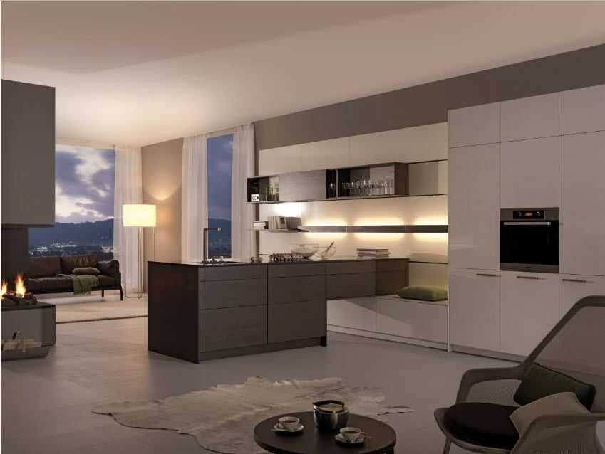 Лицевые элементы встроенной техники могут быть скрыты за дверцами, а могут быть выполнены в соответствии с общим дизайном всей мебели. Большинство версий встроенных кухонь на самом деле напоминают обычную комнату, ведь все элементы в них надежно скрыты. Даже мойки конструируют так, что видно их только во время эксплуатации.