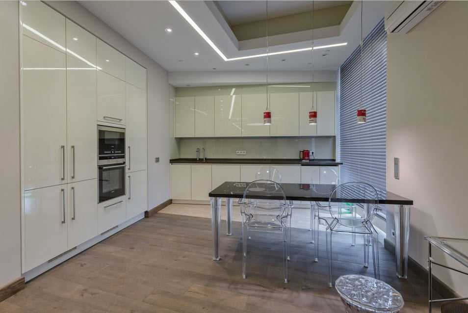 Самый интересный тот, при котором вдоль одной стены устанавливается плита, раковина и рабочая зона, а с противоположной от нее – холодильник и другие места хранения продуктов и мелкой бытовой техники.
