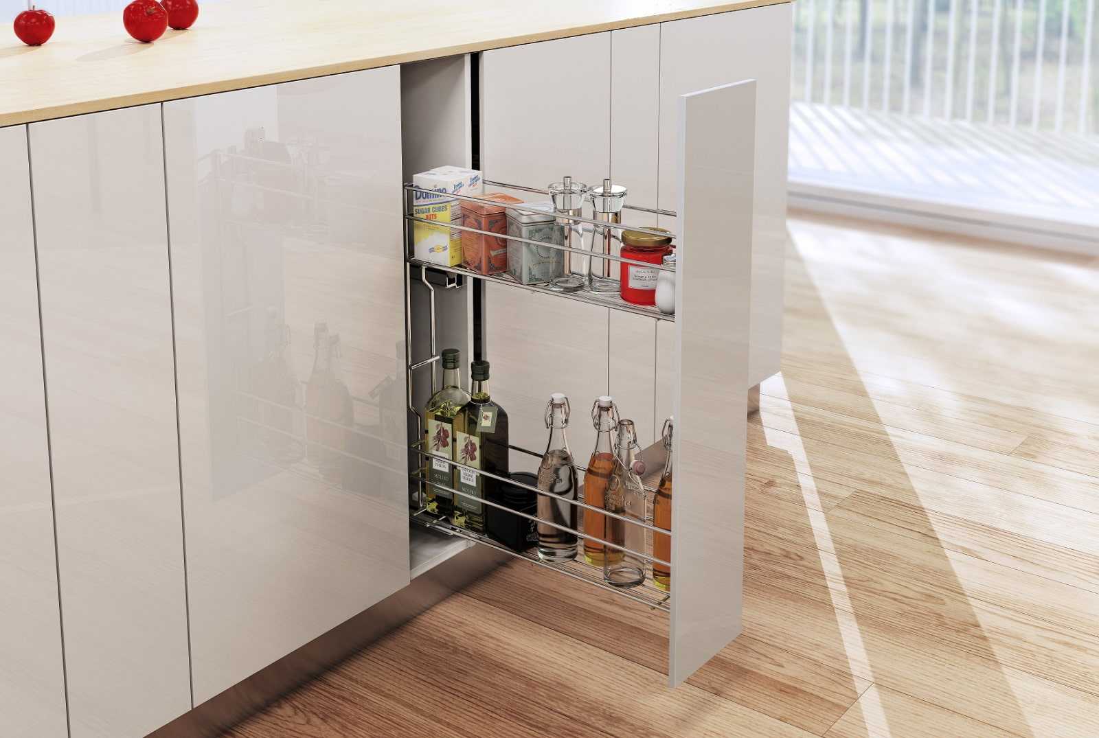 Шкафы карго для кухни отличаются различным количеством уровней. Так, выделяются одноуровневые корзины, которые считаются универсальными вариантами, применяемыми как для узких, так и для широких тумб. В системе с одним уровнем удобно хранить крупную бытовую технику, которая нечасто используется, аксессуары к духовым шкафам и грилю, такие как противни или решетки. Если ширина выдвижной корзины для кухни 300 мм и менее, то она подойдет для хранения баночек со специями, бытовой химии или высоких емкостей. Другие варианты карго: